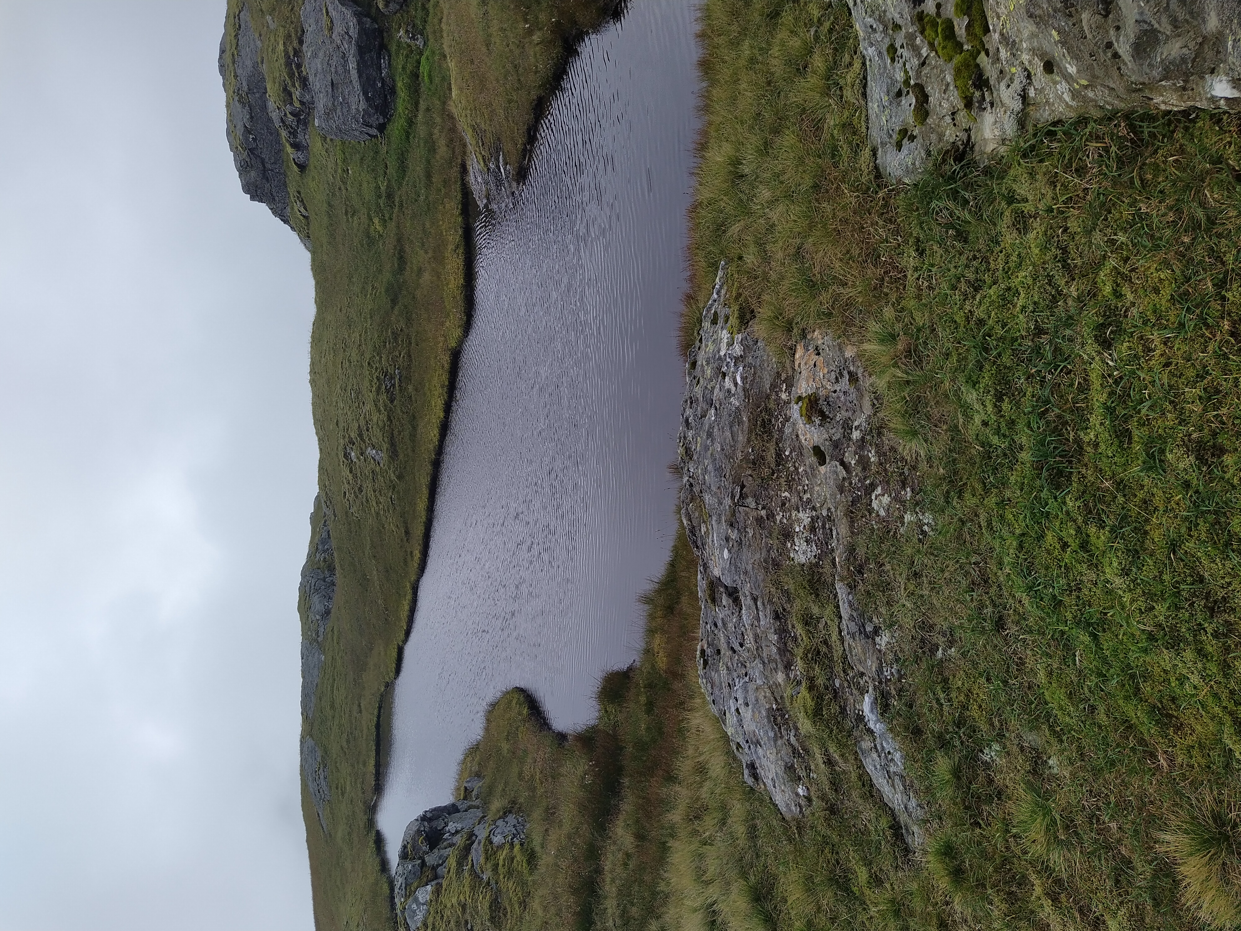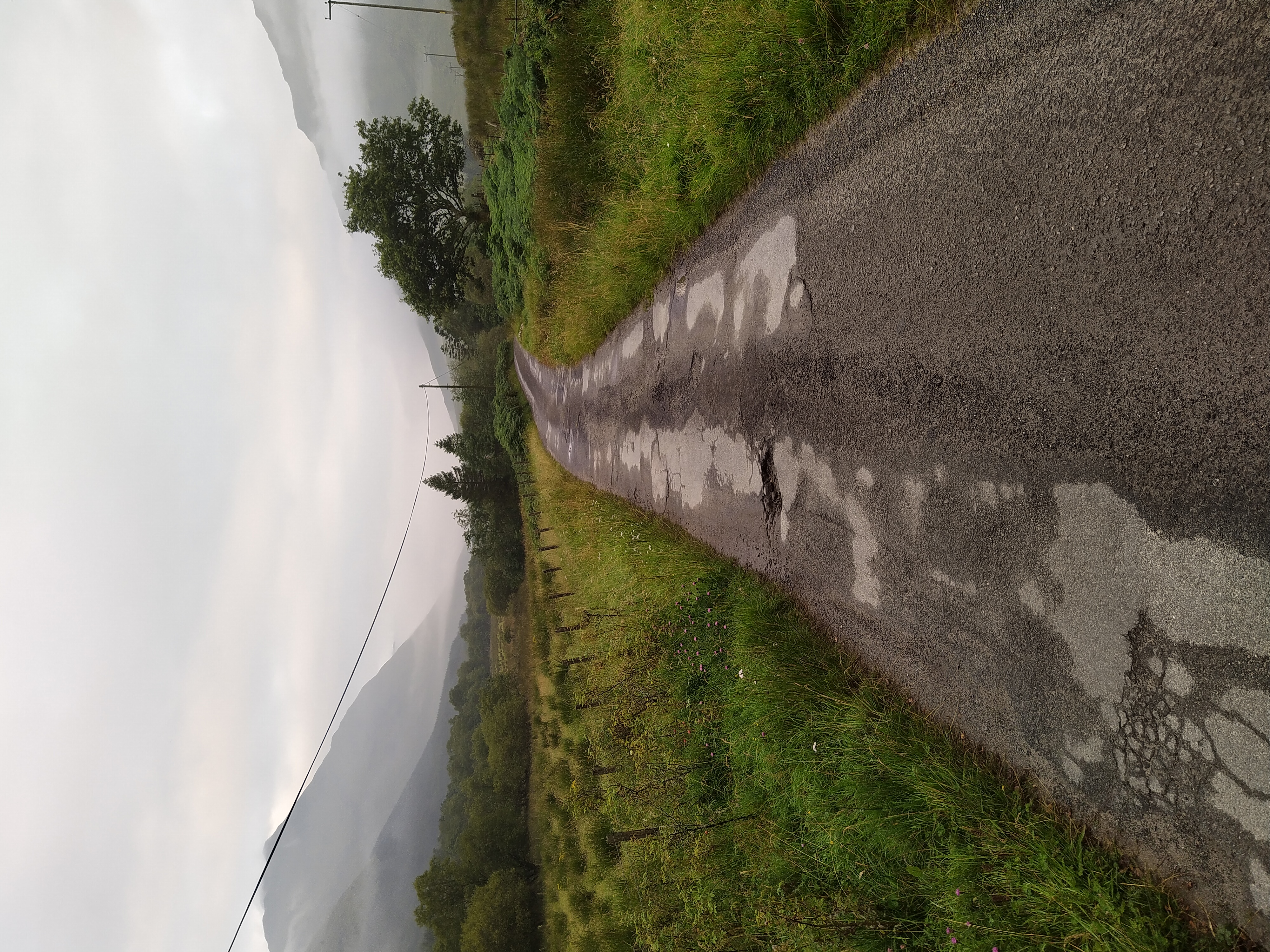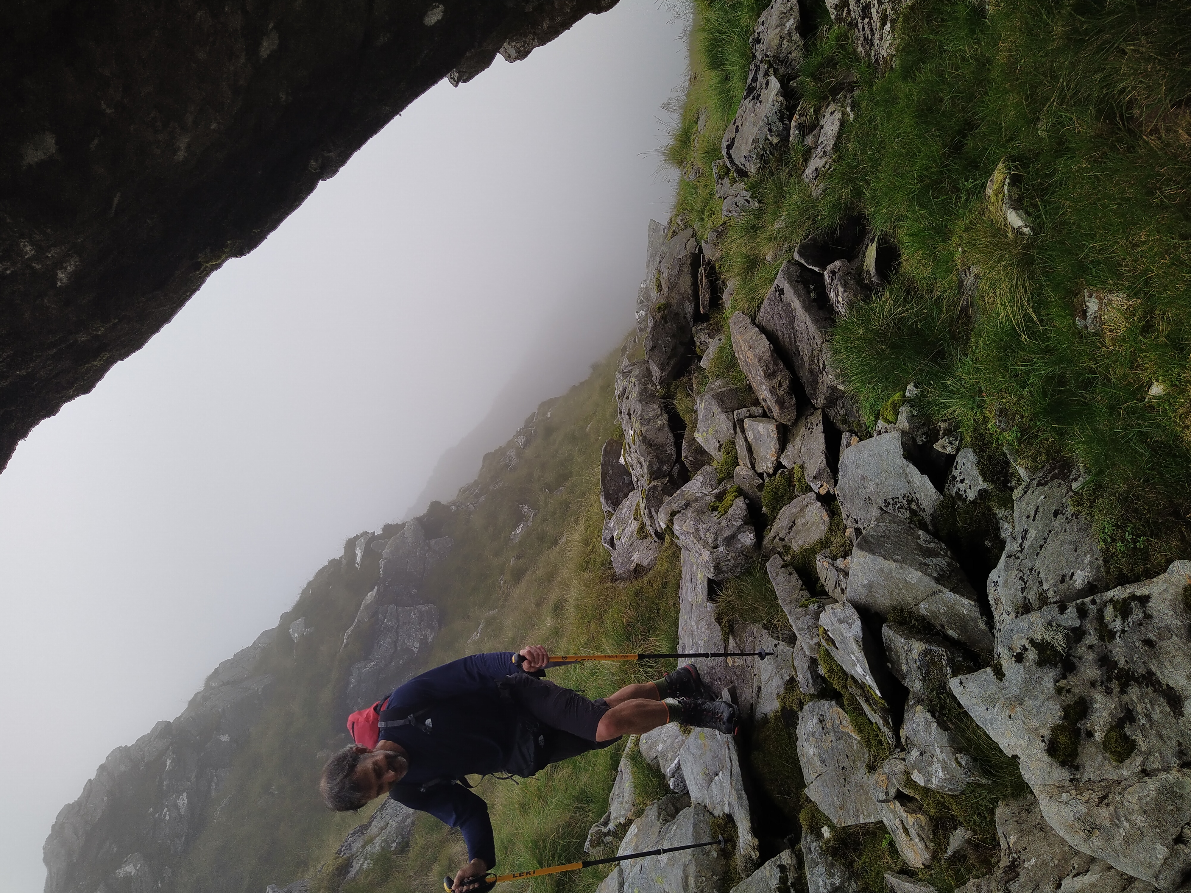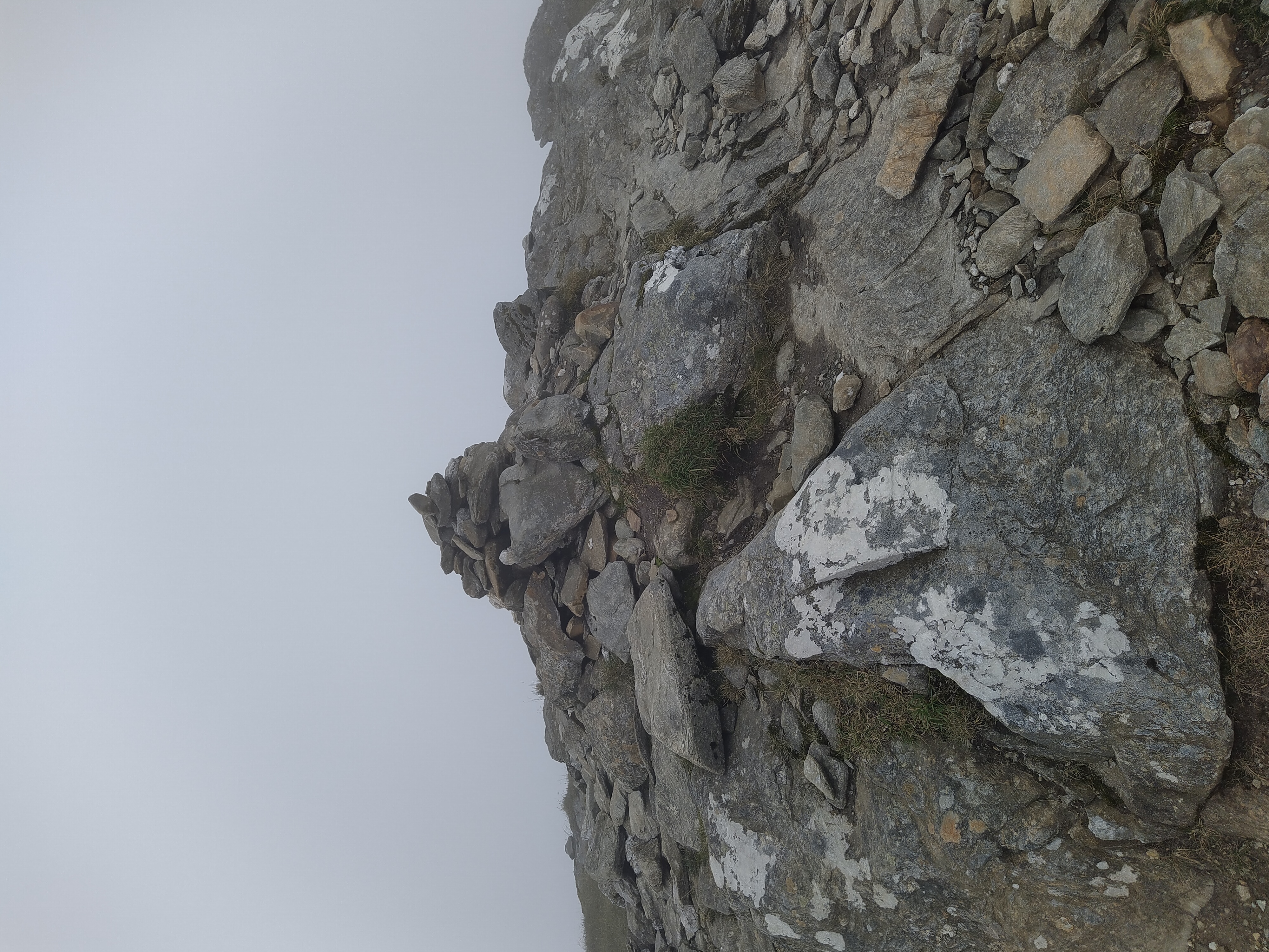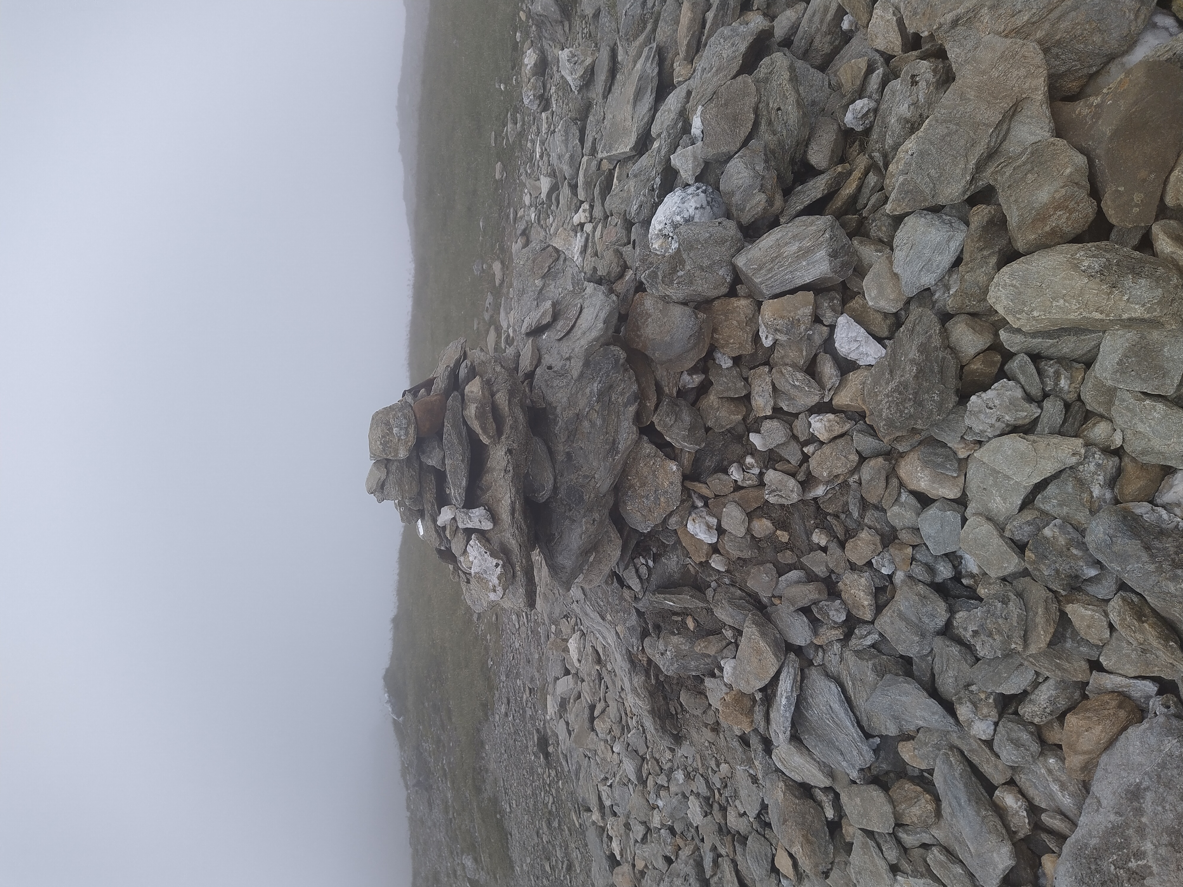 After walking from the wild camp site near the car park at Inverlochlarig we walked up the road for a while before turning right up a very steep grassy slope. Eventually we meet rock formations blocking our path up the southeast face of the mountain. After some tribulations we found a suitable path up to the first summit below the top of Beinn a' Chroin. The path to An Caisteal was initially covered with low cloud, as we scrambled down and then up the path to the peak of An Caisteal where the low cloud and wind made for the worst conditions of the day. The path up had been too difficult to return on so we sought another route to the southwest down towards a stream which we then followed to meet the road and finish with a long stint on the flat. Back at the car park we changed our shoes and felt jaded by the two days of walking. 19-08-2020